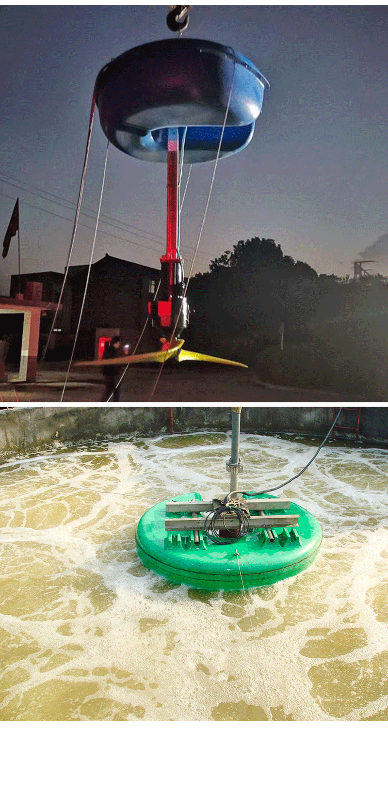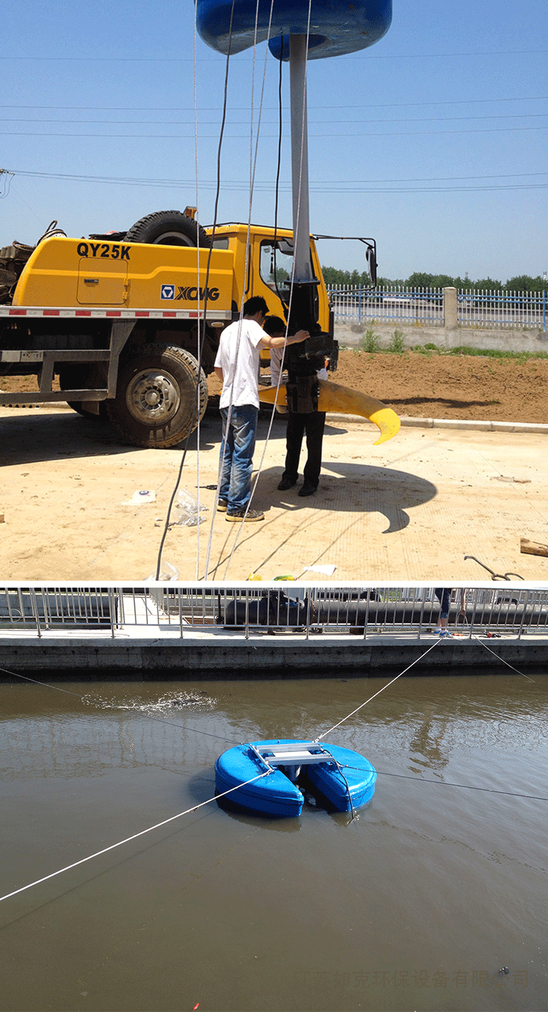 时潜水电机带动推进式叶轮、叶桨工作,使流体产生一定流速和流场,向水池底部和 四 周 形