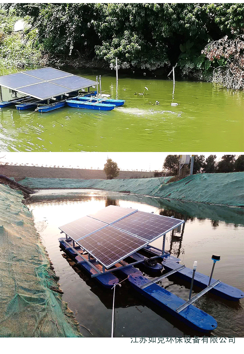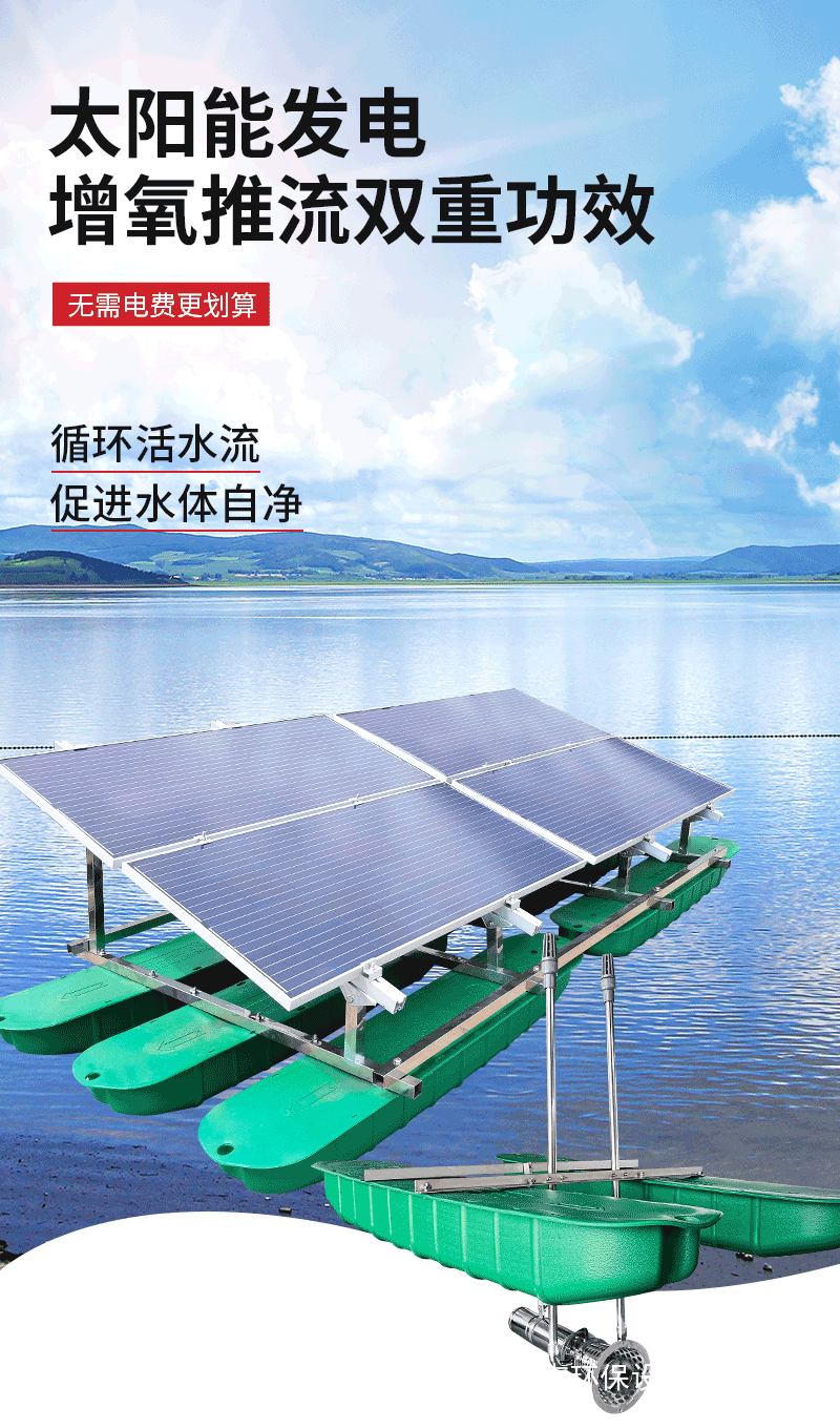 太阳能推流曝气机是一种曝气、推流循环的设备,具有增氧、推流循环双重功效,主要应用于:湖泊、河道、水库、氧化塘和污水塘等水域。水域进行适当曝气,进行好氧生化处理。在池中,有机物被微生物进一步生化降解,浓度继续下降;氨氮被硝化,使 NH3-N 浓度下降,随着硝化过程 NO3-N 的浓度增加;活性污泥中聚磷菌在好氧条件下大量吸收污水中的磷,把它转化成不溶性多聚正磷酸盐在体内贮存起来,通过排放剩余污泥达到除磷的目的。因缺氧而引起的异味、黑臭及蓝绿藻泛滥。