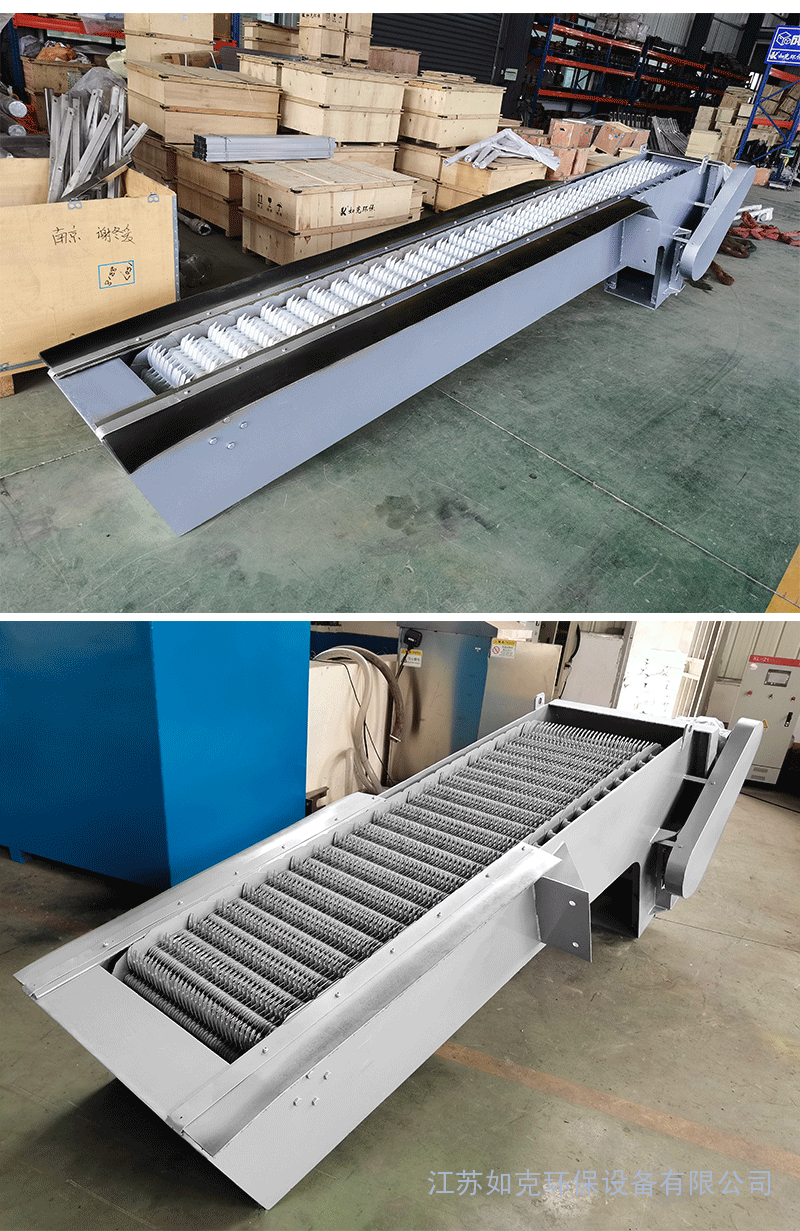 (11)当齿耙链运行到设备后部时,齿耙间发生相对位移,进行自清理运动,栅渣落入栅渣小车中。因而不会发生堵塞现象,故日常维修的工作量很少且格栅底部不会有污物堆积死角。