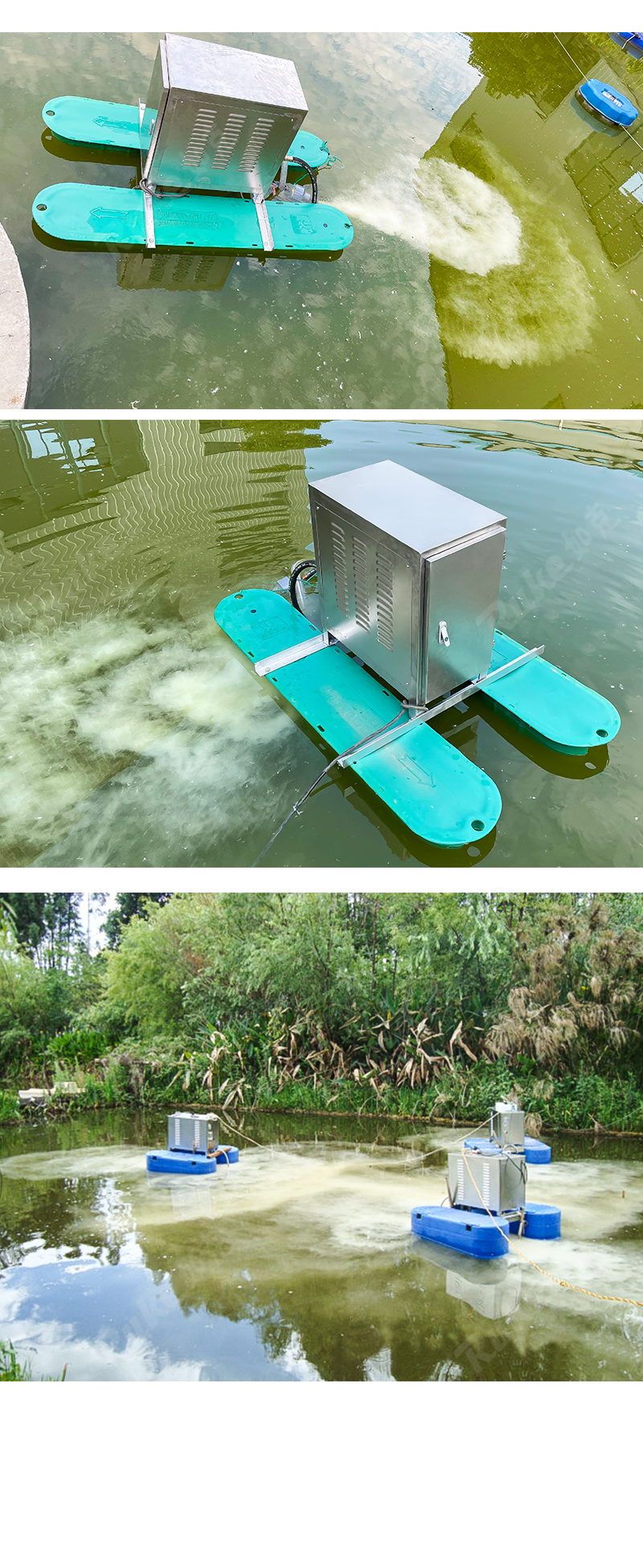 微纳米曝气机由主机、溶气系统、释放系统等组成。RWP微纳米曝气机通过主机泵将气体和水混合后输入到溶气罐,使气体溶解在水中,继而通过释气装置将溶解气体释放出来形成微纳米气泡,并以高速射流到水中,实现水质的净化。微纳米气泡在水中的溶解率超过85%,溶解氧浓度可以达到饱和浓度以上,并目微纳米气泡是以气泡的方式长时间存留在水中,可以跟随着水流的方向全方面增氧,也可以随着溶解氧的消耗不断地向水中补充活性氧,让水体不缺氧,为净化处理污水的微生物提供了充足的活性氧、强氧化性离了团,并保证了活性氧充足的反应时间。经过RWP系列微纳米曝气机处理后还原的洁净水,水中的溶解氧含量标准为4ppm(4毫克),水自身的净化能力远远高于自然条件下的自净能力。