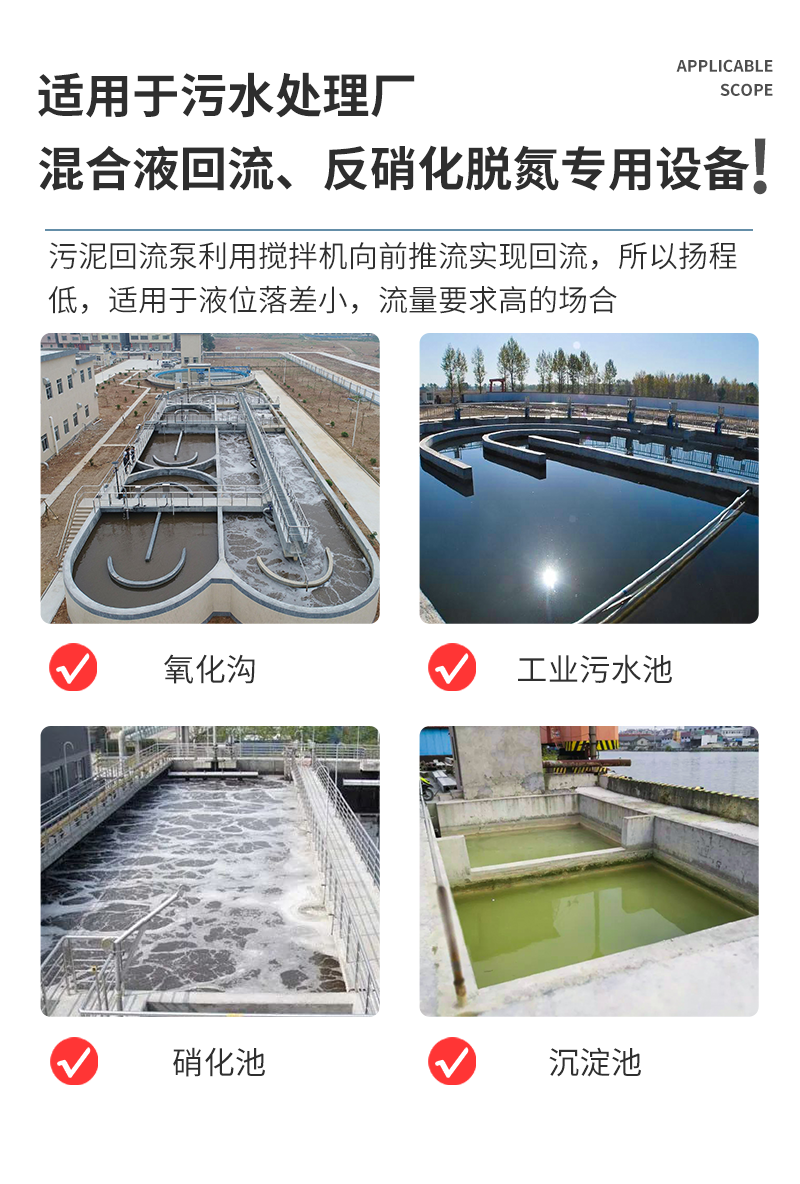 QJB-W型潜水污泥回流泵是在德国潜水电机生产技术基础上自行研发的 产品,QWH型潜水污泥回流泵为二级污水处理厂混合液回流、反硝化脱氮的 设备。亦可用于地面排水、灌溉和废水处理 过程中再循环等需要微扬程、大流量的 场所。